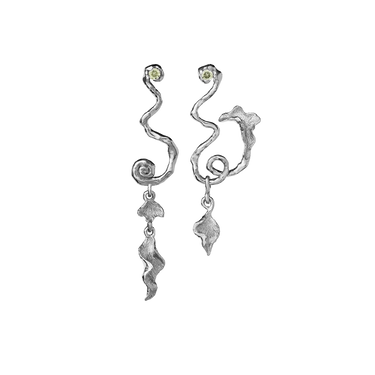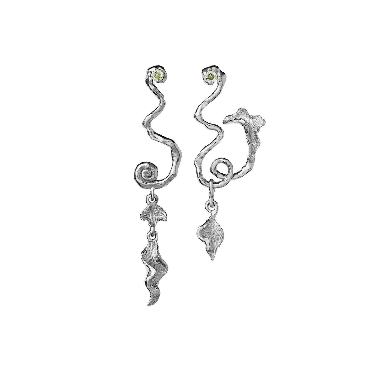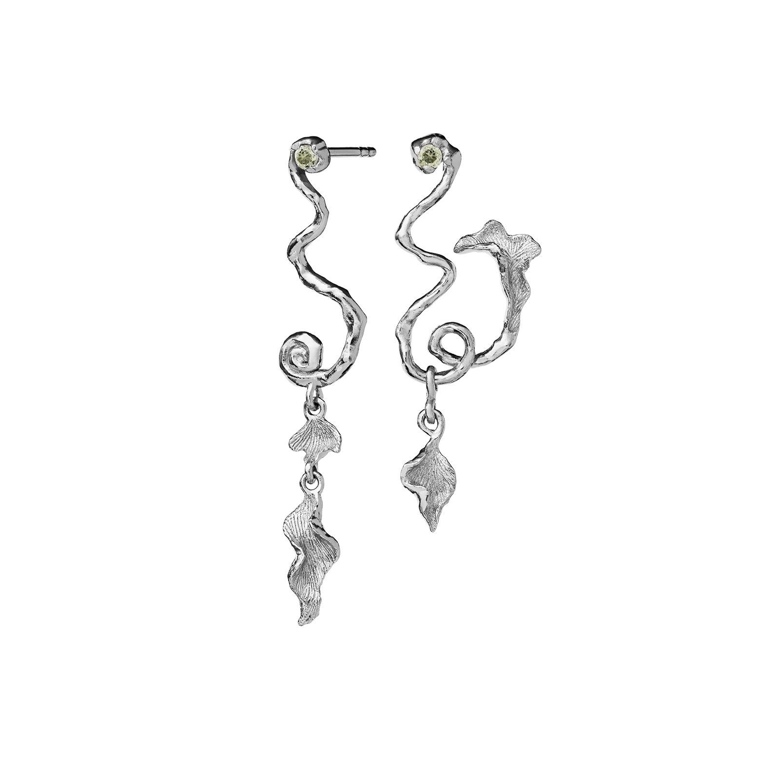 Unike og asymetriske øreringer inspireret av naturen. Øreringene er vakkert formet med en delthet tekstur av foldede blader og en liten fasettert og skinnende sitronkvarts.