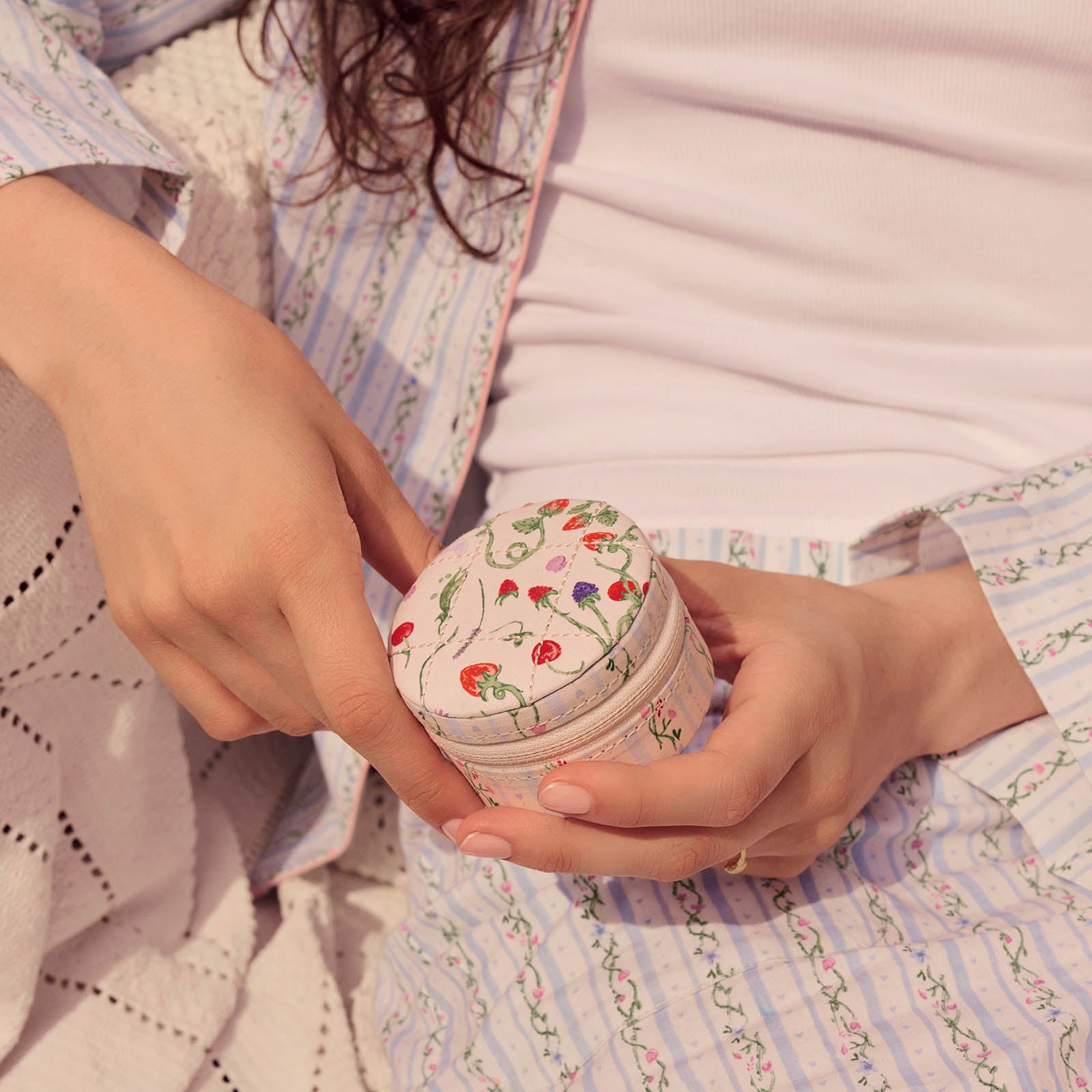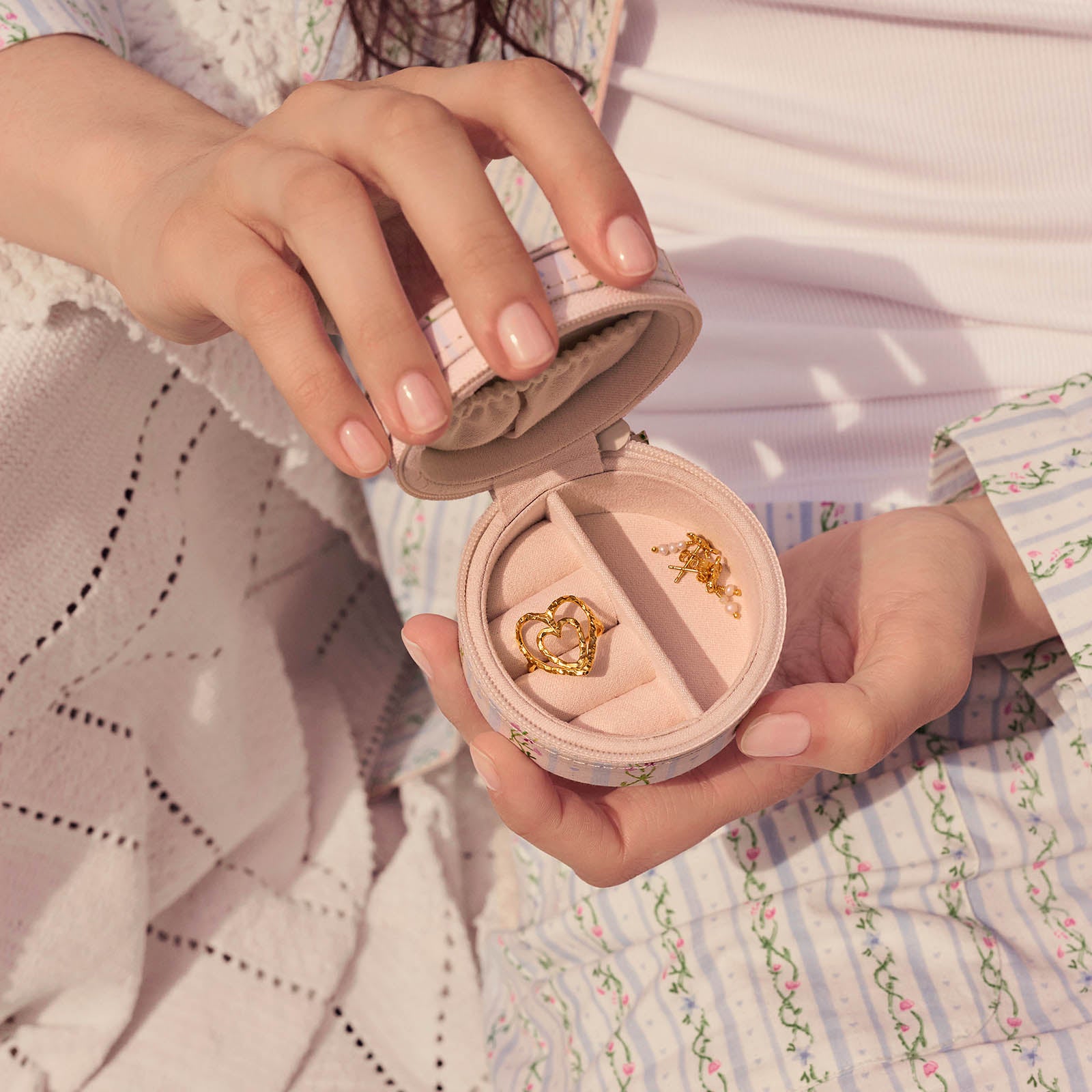 Vårt lille, runde smykkeskrin er ren sommernostalgi. Kompakt og lett å bære, men romslig nok til å romme dine verdifulle smykker – og de fantastiske minnene de bærer med seg.