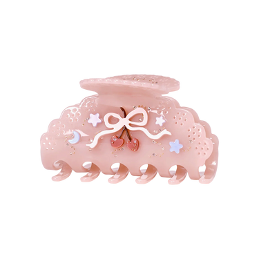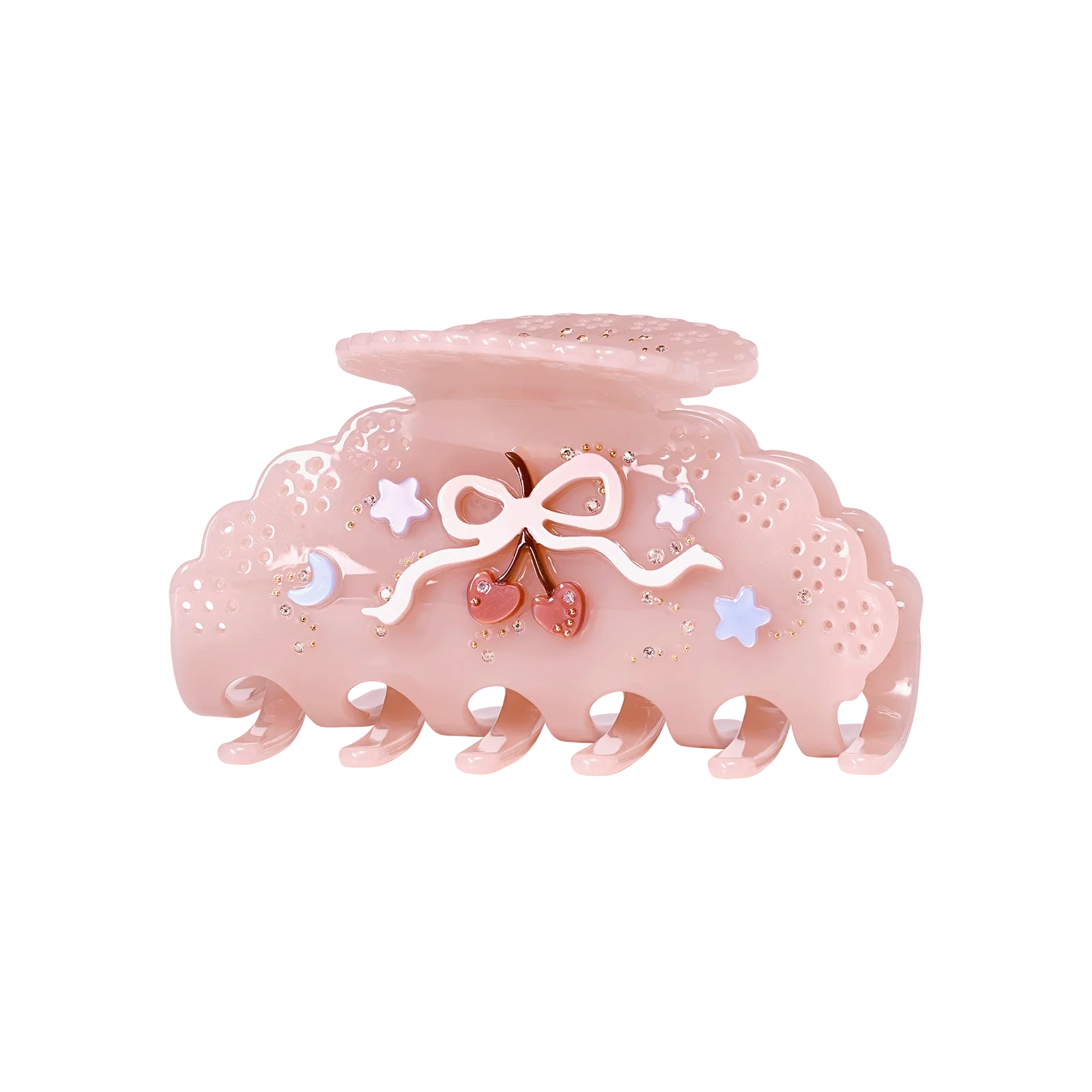 Søte kirsebær pryder Cirera-hårspennen vår, som i en harmoni av slør, måner og stjerner skaper en hårspenne verdig en rosa sommerdag.