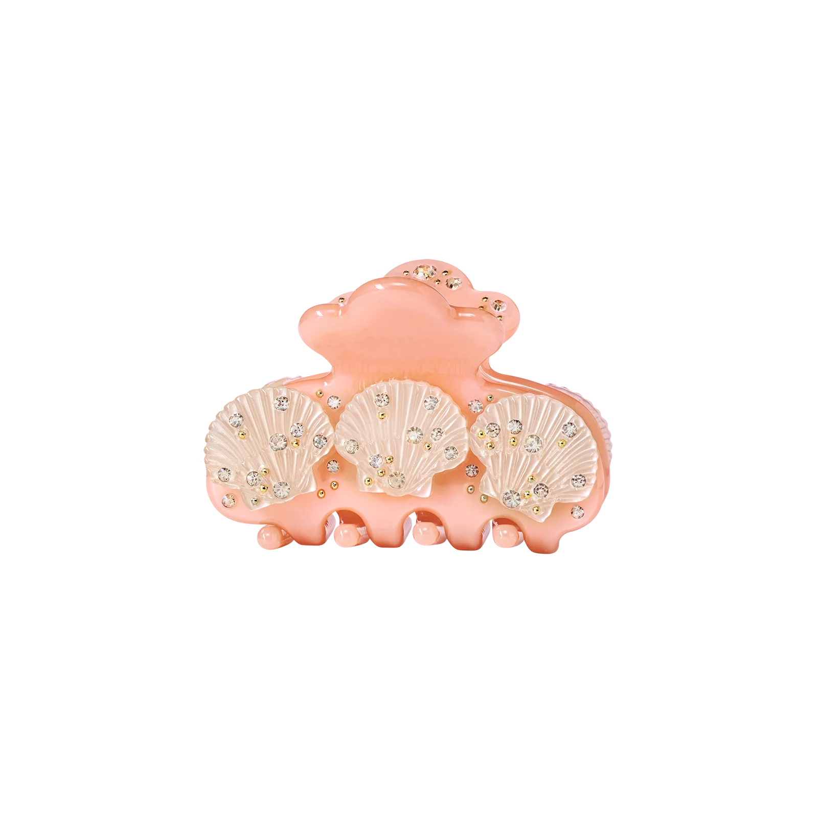 Vår Kerang-hårspenne er en samling av verdifulle skjell som nettopp har skylt i land på stranden, med dråper av saltvann som reflekteres i solen.