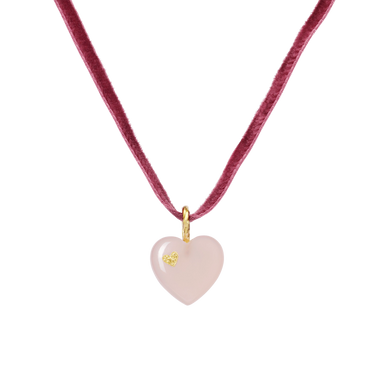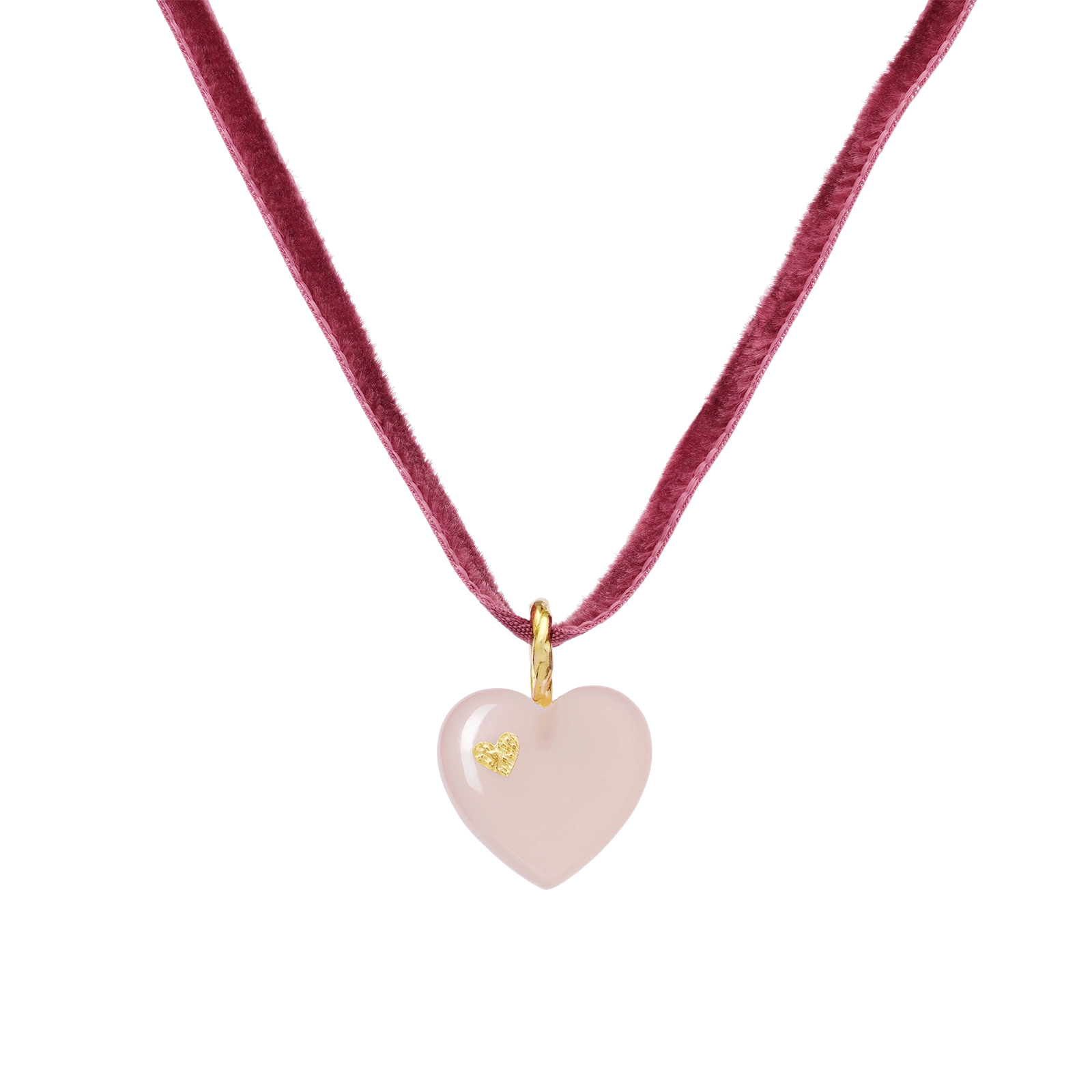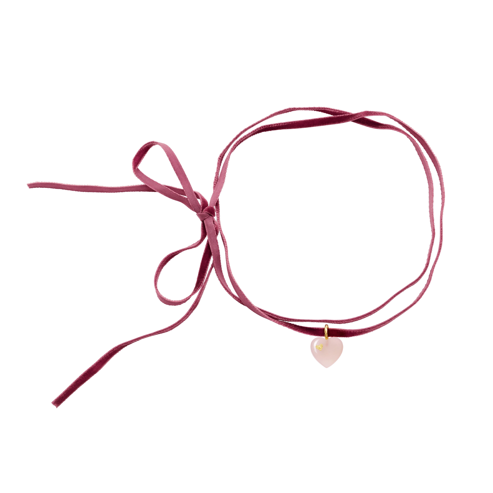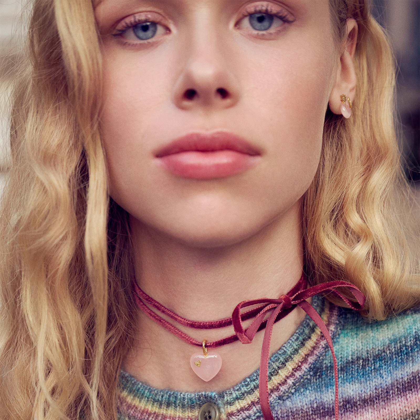 Med sitt myke velourbånd smyger Love Choker seg forførende rundt halsen din og binder deg til kjærligheten som stråler ut fra det hjerteformede anhenget i rosa kalcedon. Materialer: Rødt velourbånd, resirkulert sterlingsølv (925) belagt med 18K gull, rosa kalcedon Størrelse: Velourbånd: 140 cm Anheng: Lengde 17 mm, bredde 88 mm