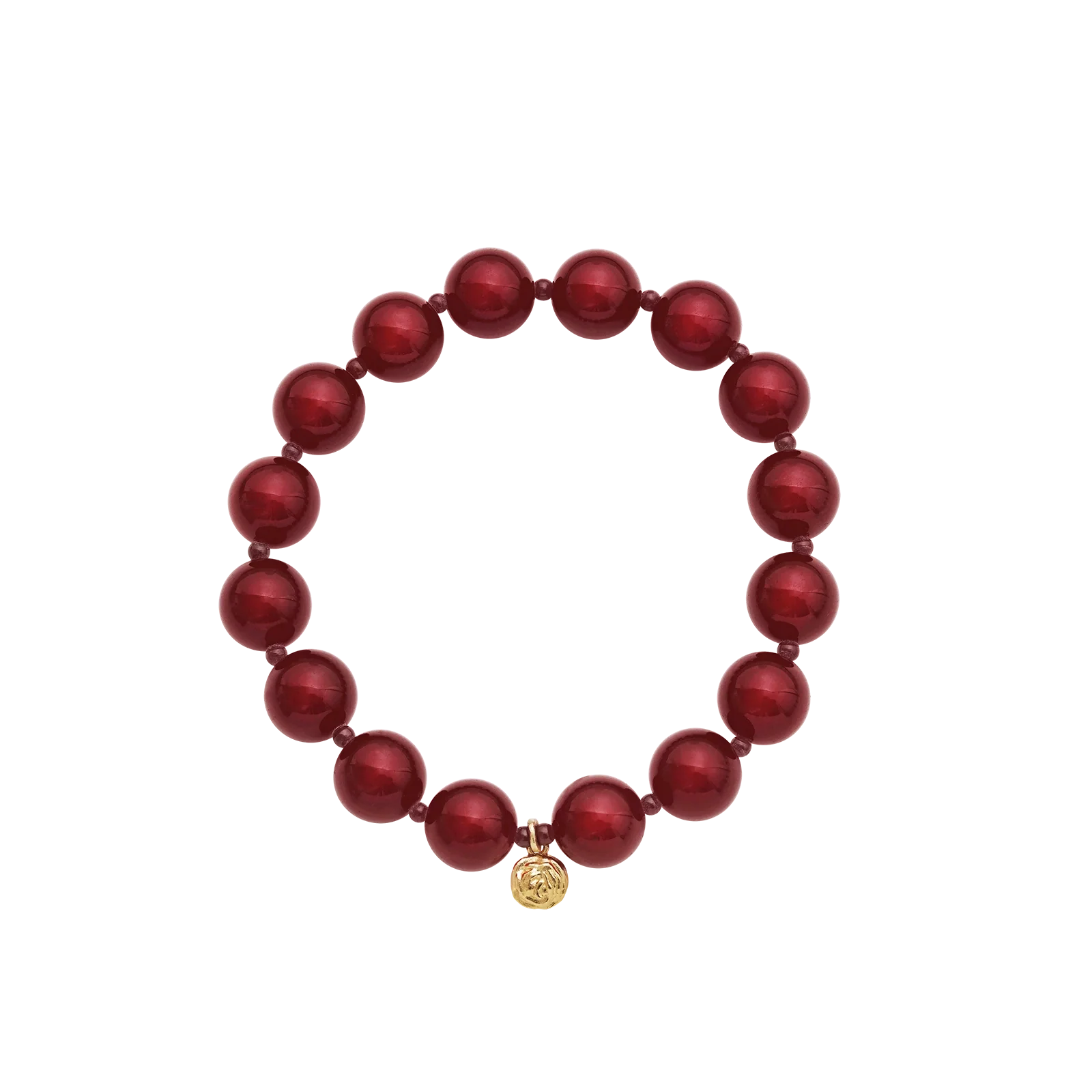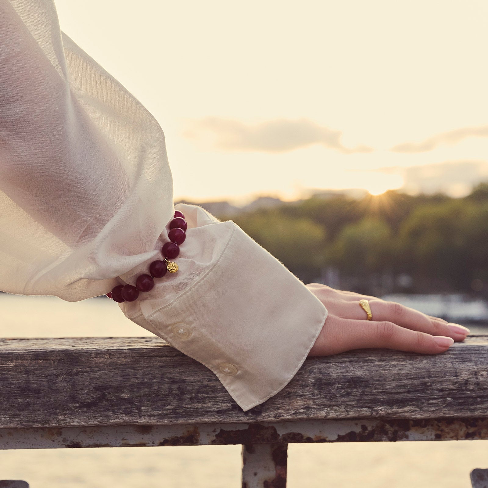 Vårt Shani-armbånd er inspirert av tradisjonelle chakra-armbånd, og gir både et spirituelt og elegant preg til stilen din – og et fargeklatt til et monokromt antrekk. Hver perle symboliserer nærvær og styrke, og den dype røde fargen harmonerer vakkert med de fleste stiler.